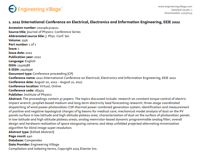 Papers submitted to EEIE2025 be reviewed by technical committees of the conference. All accepted full papers will be published in the Proceedings of SPIE - The International Society for Optical Engineering (ISSN: 0277-786X) and will be submitted to EI Compendex, Scopus and Inspec for indexing.