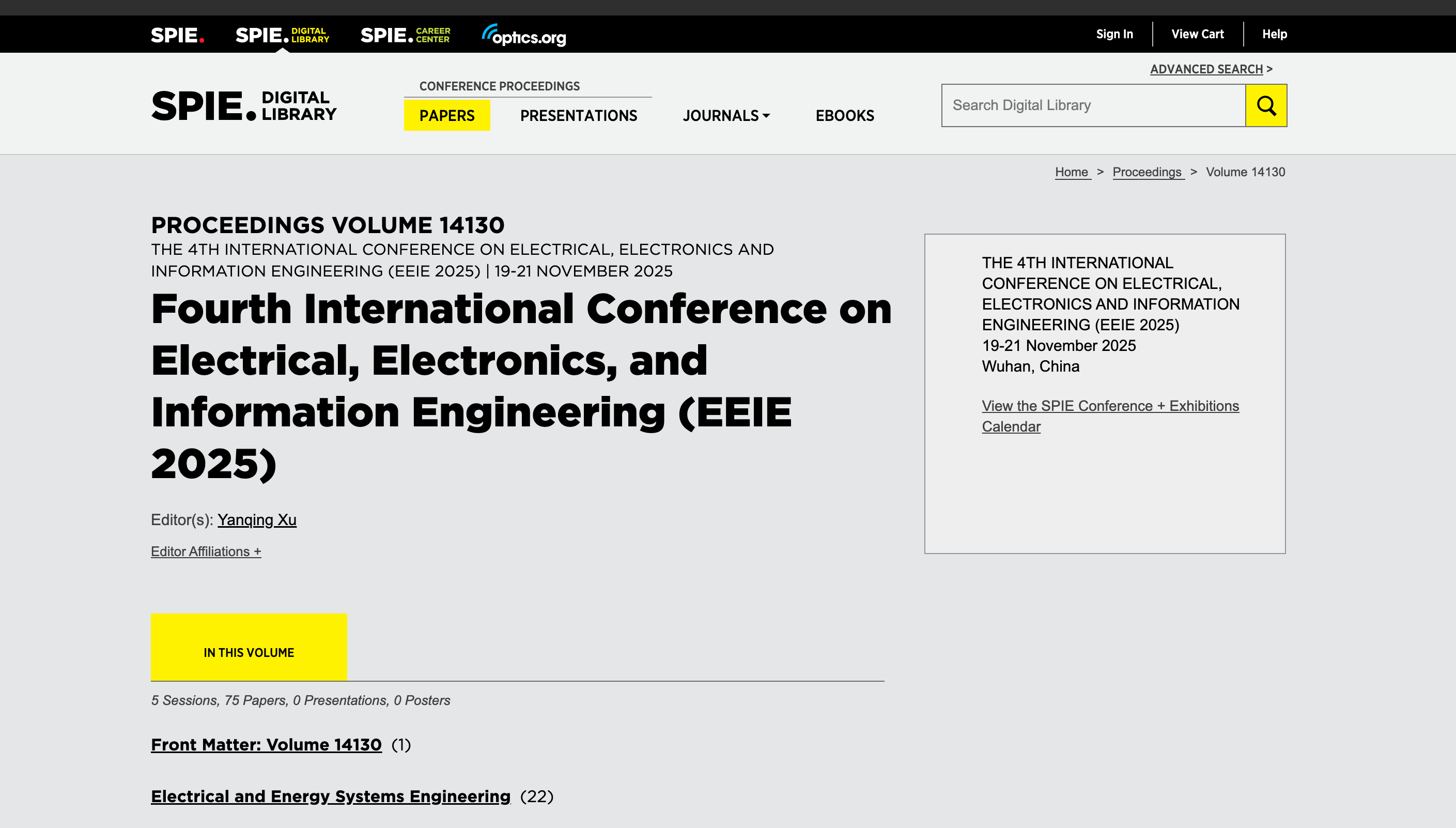 All papers submitted to EEIE 2025 all accepted papers have been published by SPIE - The International Society for Optical Engineering (ISSN: 0277-786X) in the Conference Proceedings ( https://www.spiedigitallibrary.org/conference-proceedings-of-SPIE/14130.toc )